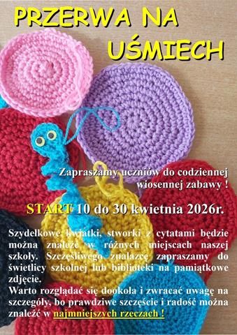 Zapraszamy uczniów klas I-VIII do wiosennej zabawy. Ruszamy już w najbliższy piątek 10 kwietnia. Bądźcie czujni i rozglądajcie się uważnie. Szydełkowe niespodzianki będą znajdować się w różnych miejscach naszej szkoły. Życzymy udanej zabawy i wielu pozytywnych emocji.Szczegóły zabawy zawiera plakat.