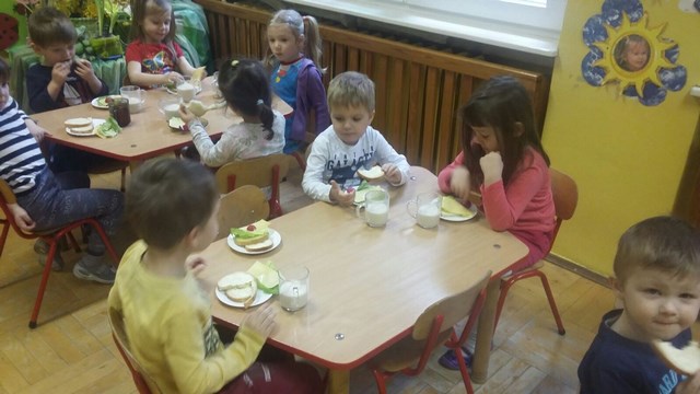 Każda okazja jest dobra do kontaktu z książką. Pani bibliotekarka chętnie nas odwiedza i proponuje nam ciekawe lektury do których wykonujemy prace plastyczne. Kiedy słońce mocniej przygrzewa za oknem, nie tracimy czasu w sali, tylko zabieramy książki oraz ulubione zabawki i udajemy się na podwórko. Oczywiście dbamy również o to, aby nasze brzuszki również były usatysfakcjonowane!