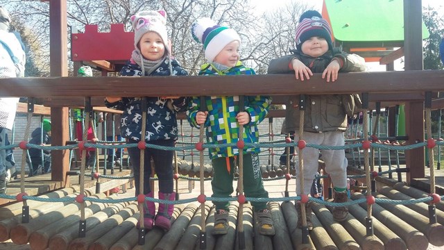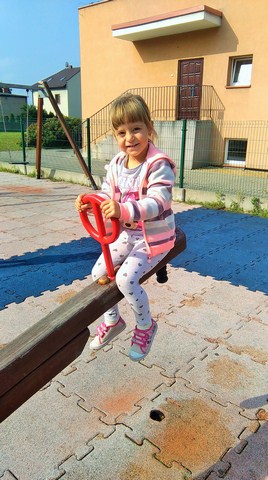Pierwsze wyjście na pobliski plac zabaw. Maluszki radosne, uśmiechnięte.