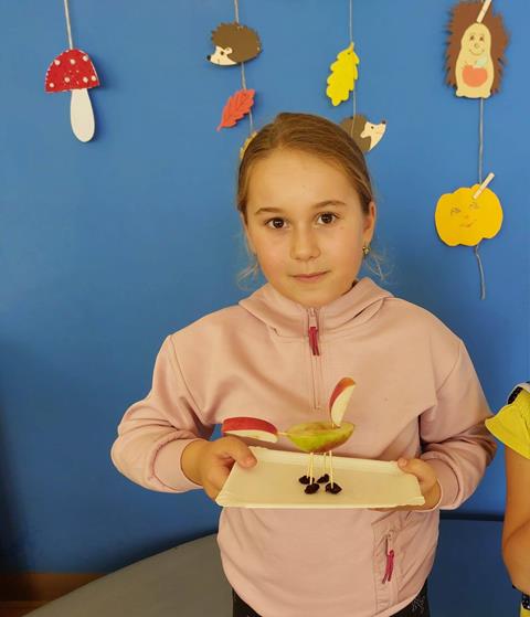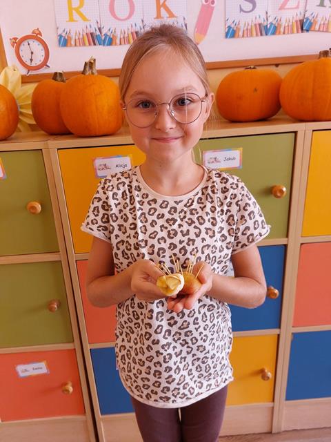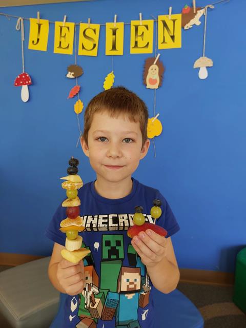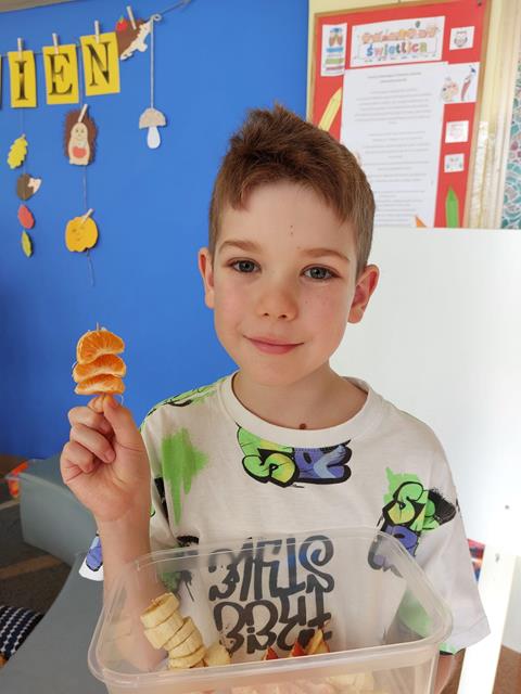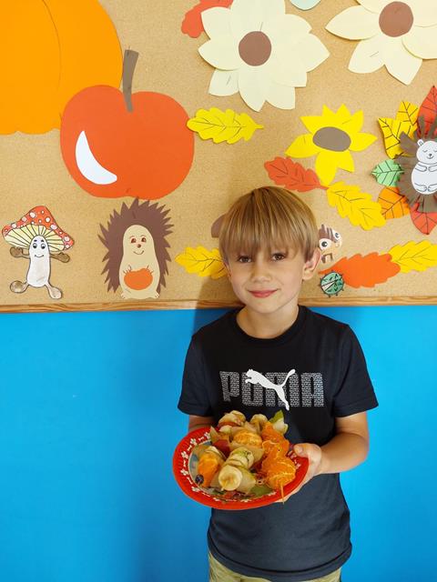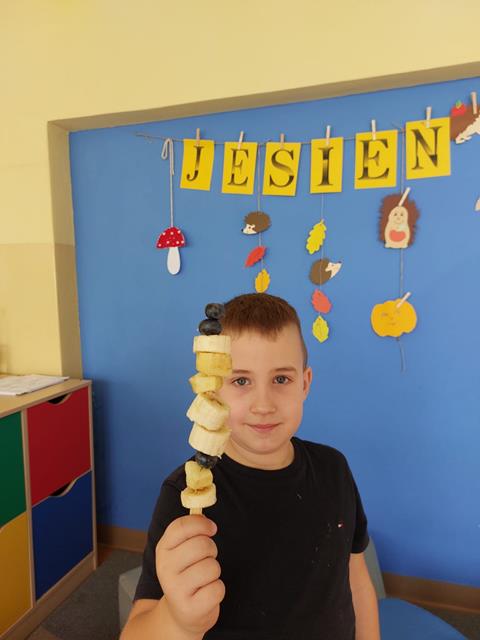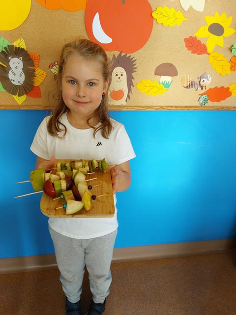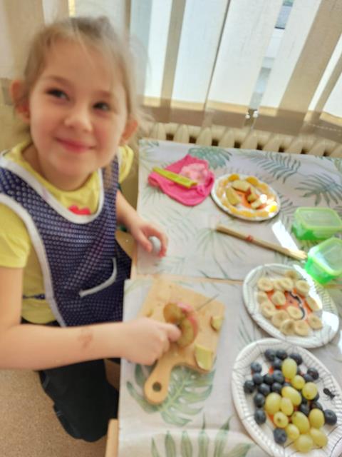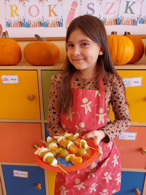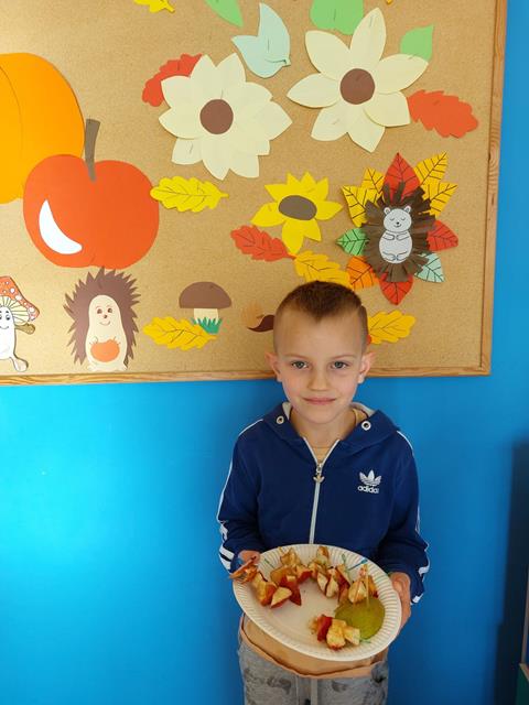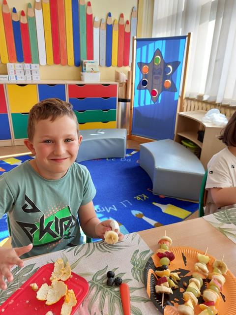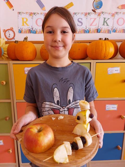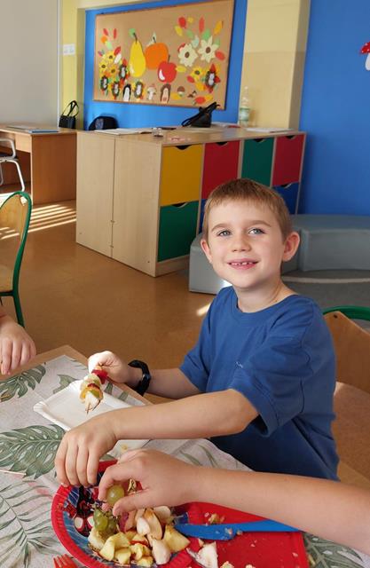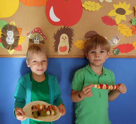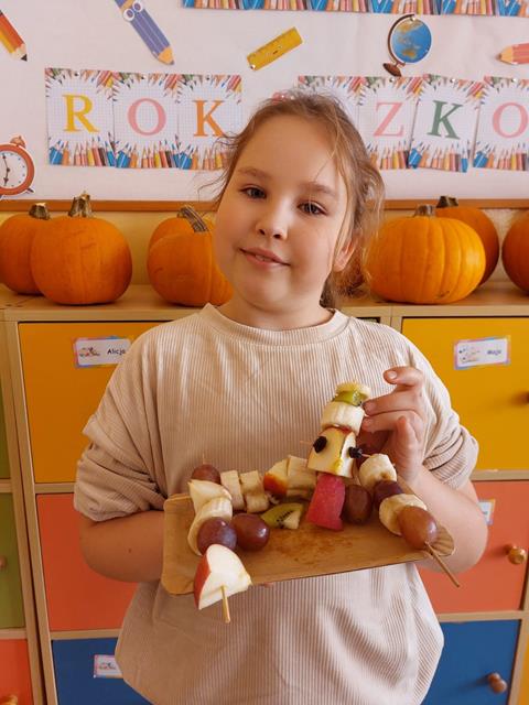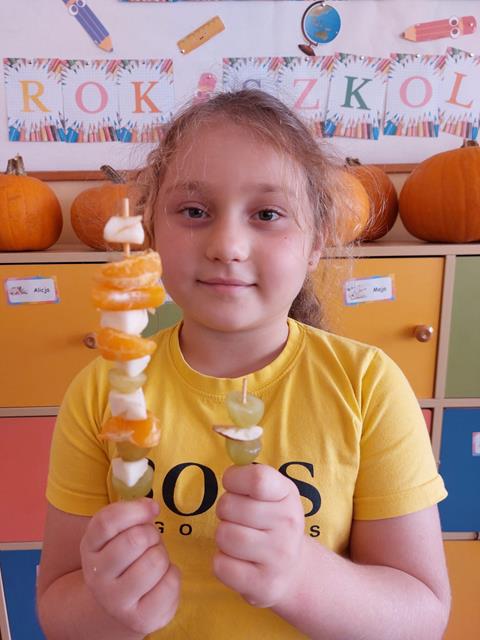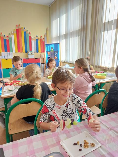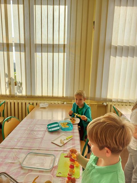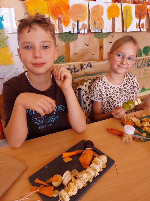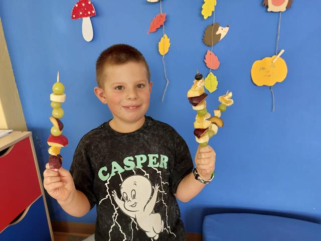 Uczniowie klas młodszych podczas zajęć świetlicowych przygotowywali zdrowe przekąski z owoców i warzyw. Dzieci wykonywały owocowe szaszłyki, powstały również fantastyczne postacie, zwierzątka. Zdrowe przekąski były nie tylko piękne, ale bardzo smaczne.