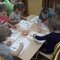Grupa Misiów polubiła jesienną aurę. Babie lato i kolorowe liście zagościły nawet w naszej sali. Wykorzystując słomki do napojów i tusz kreślarski, ustami wydmuchaliśmy drzewa, na których pojawiły się żółte, pomarańczowe i czerwone kulki bibuły. Z kolei małe pajączki znalazły swoje pajęczyny na papierowych talerzykach. Wszystkie Misie w skupieniu tworzyły za pomocą wełny małe sieci pajęcze.